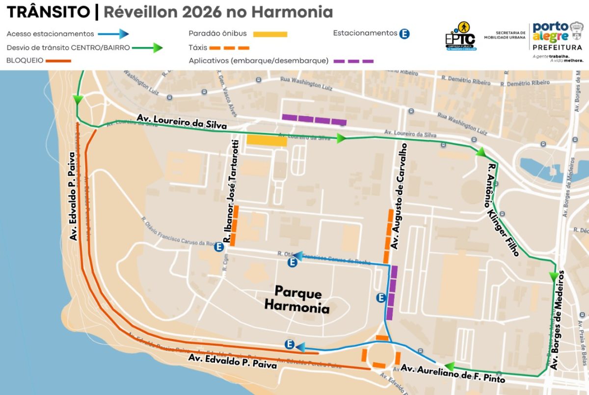 A Empresa Pública de Transporte e Circulação (EPTC) divulga as alterações de trânsito no entorno do Parque Harmonia para a festa de Réveillon 2026. Motoristas e pedestres devem ter atenção em pontos como as avenidas Edvaldo Pereira Paiva e Augusto de Carvalho. Confira abaixo: